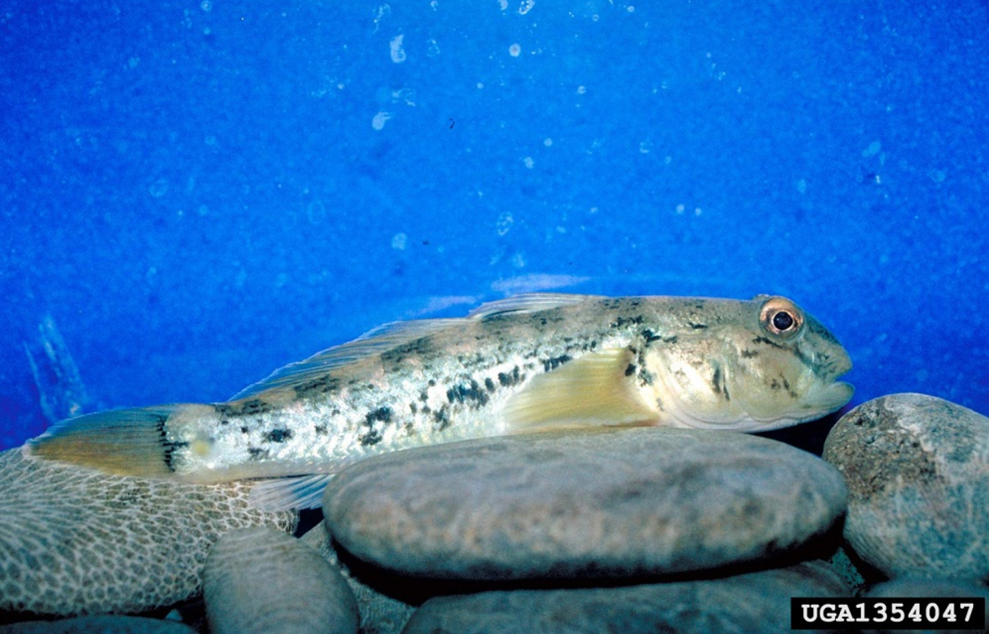 The round goby (Neogobius melanostomus) is an invasive fish that was introduced to the Great Lakes in the early 1990s through ballast water on ships from the Black Sea. Native to the freshwater region of Europe’s Black and Caspian Seas, they continue to be spread by being transported and dumped from bait buckets and water-containing compartments of boats. They also swim through both natural and manmade waterbodies such as rivers and canals to reach new waterbodies. Round gobies are brownish-gray in color with dark brown or black splotches. During spawning and nest guarding season, males have black bodies with yellowish spots. They can also be identified by their puffy cheeks, raised eyes, and single, fused pelvic fin. They can be distinguished from the native sculpin by the prominent black spot at the base of their first dorsal fin. They are aggressive, reproduce quickly, and have big appetites, allowing them to outcompete and reduce native fish populations, which negatively impacts fishing and tourism industries. They also feed on disease-carrying mussels, which increases the mercury content of sportsfish which consume them and has resulted in botulism outbreaks among native fish and birds. Round gobies further act as a vector for viral hemorrhagic septicemia (VHS), a serious, fatal fish disease affecting many native species.