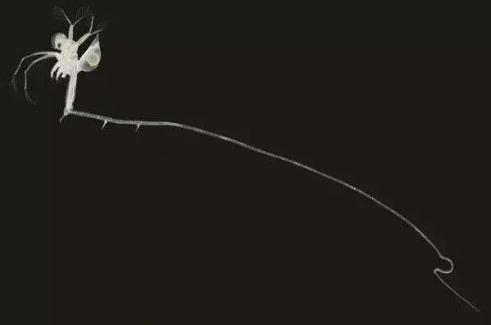 The fishhook water flea has a small, translucent body with black eyes. Its most distinguishing feature is its long, slender tail, which has three barbs and a characteristic S-shaped hook at the end. Clusters of fishhook water fleas can resemble wet cotton when seen on ropes or equipment.